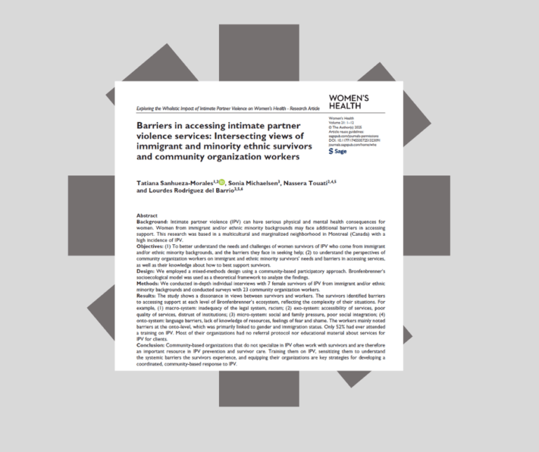 This paper examines the barriers immigrant and minority ethnic women face when accessing intimate partner violence (IPV) services in a marginalized, multicultural neighbourhood in Montreal, Canada. Using both survivor and community worker perspectives, the study highlights how systemic, organizational, and personal factors shape access to support. The authors also identify important gaps between how survivors and service providers understand these barriers, pointing to the need for more coordinated, community-based responses to IPV.