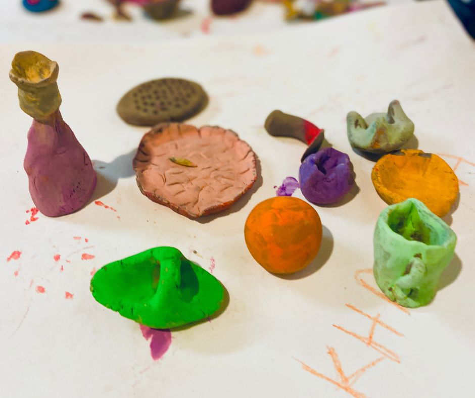 Participants engaged in a range of expressive arts modalities, including movement and dance ribbons, storytelling, clay and plasticine work, painting, visual arts, collage, music making, and culturally grounded artistic practices. Each cohort included 6–12 participants who took part in a 12-session program facilitated by a team consisting of an expressive arts therapist, a peer researcher, and a diverse group of practitioners, volunteers, and students.