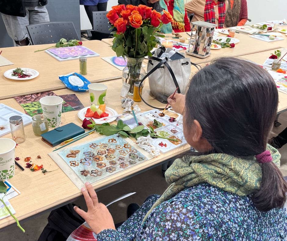 Participants created natural pigments using spices and foods such as turmeric, chocolate, coffee, beets, mint, and roses. Before any brush touched the paper or canvases, Mercy invited everyone to engage their senses smelling the herbs and foods, sharing memories, and reflecting on the colours, tastes, and traditions that connect them to home.