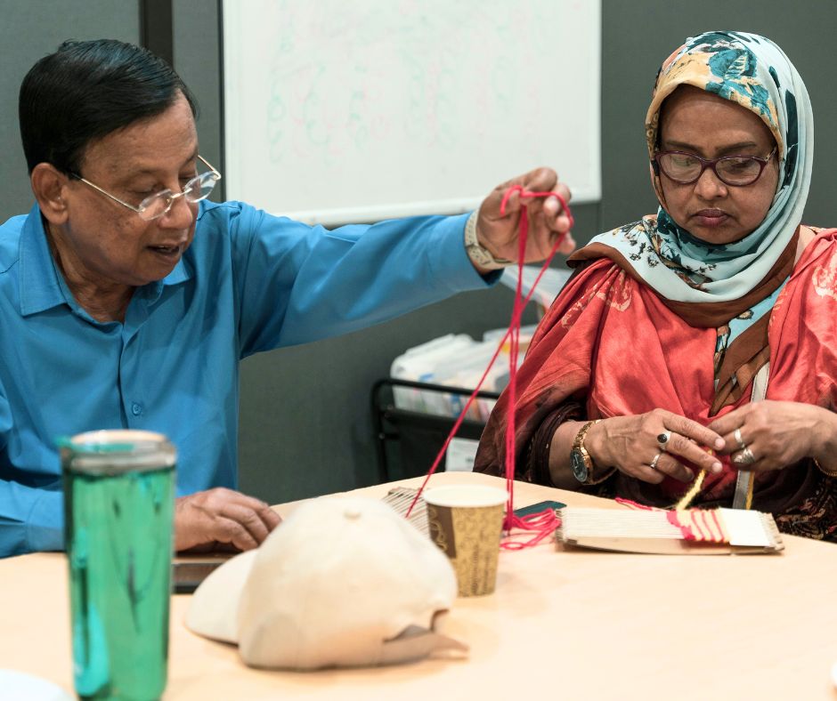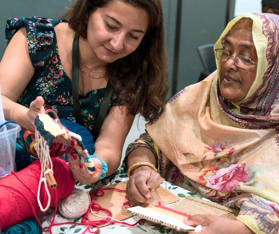 The program was led by Ebru Winegard, a Turkish newcomer and community artist who brought the art of weaving to a multi-generational group. For Ebru, the craft is inseparable from identity. “For me, weaving is a connection to my heritage and to my mother,” she shares. “My earliest memory is watching her weave on a huge loom that covered an entire wall. Returning to weaving later in life helped me reconnect with her and with where I come from.”