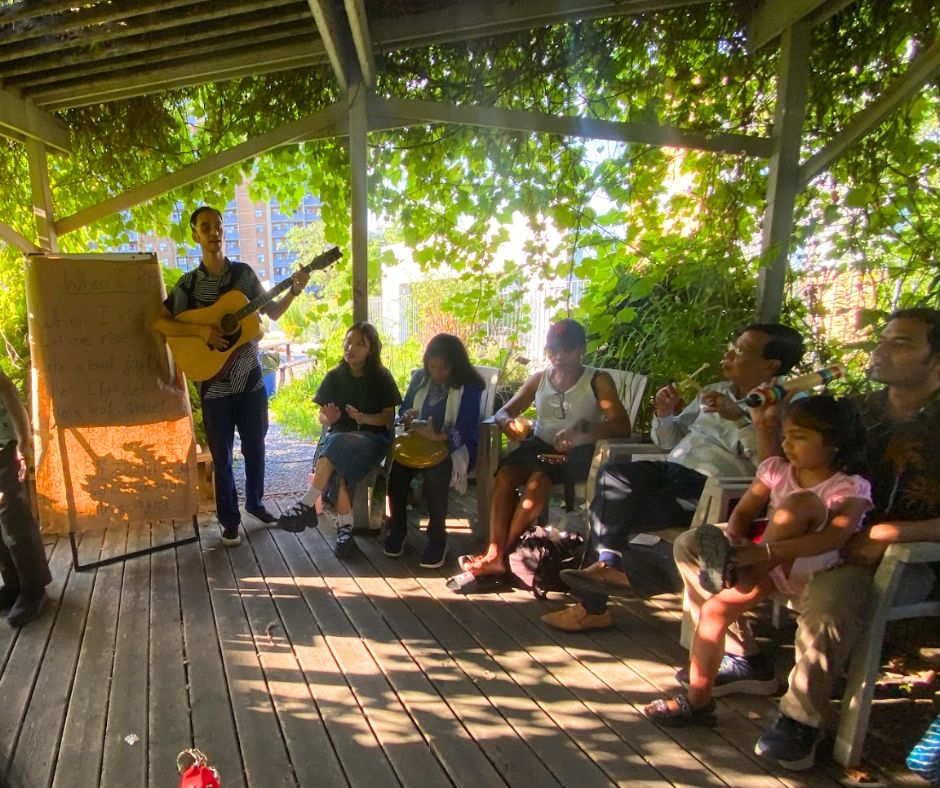 Listen to Vishal’s story about Access Alliance Tuesday Tunes program. This is an expressive arts program for newcomers of all ages in the accessible Access Point on Danforth (APOD) rooftop garden focused on community singing and using instruments to create different sounds. It is facilitated by different expressive arts and community artists.