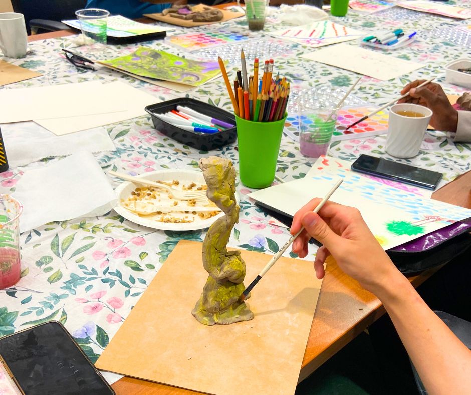 2. Mind–body experience: Trauma is shaped by both physiology and neurobiology (Malchiodi, 2023). Expressive arts are particularly effective, as they activate all the senses. Rhythm, painting, movement, image-making, and sound offer pathways to regulation that do not require someone to verbalize their trauma. This is especially important for newcomers who may not feel safe, ready, or able to speak about their experiences.